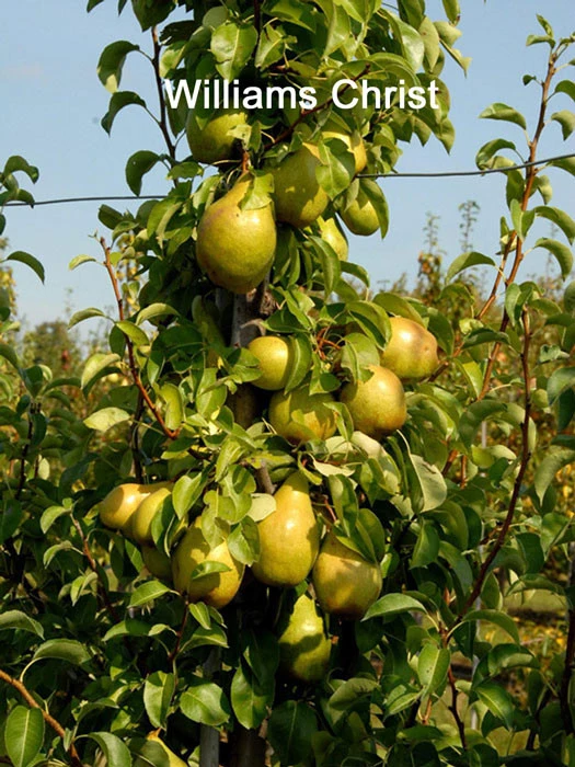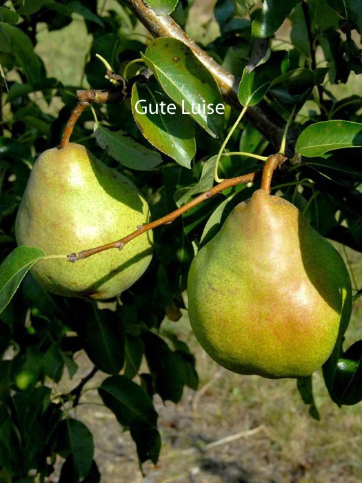 | Frucht: | Williams Christ: Glockenförmig; glatte, grünliche, später goldgelbe Schale, sonnenseits mit rötlichem Hauch; goldweißes, schmelzendes, saftig-süßes Fleisch, parfümiert, kräftiges Aroma. Conference: Mittelgroß, flaschenförmig länglich; rauhe, grünliche, fleckig berostete Haut; gelblichweißes bis lachsrotes, sehr saftiges Fleisch, süß und aromatisch, schmelzend. Gute Luise: Mittel, länglich eiförmig; glatte, gelbgrüne, geschmeidige Haut, sonnenseits flächig braunrot; weißes bis gelblichweißes, sehr schmelzendes, saftiges Fleisch; süß, angenehme Säure. Nojabrskaja: Groß, bauchig, gleichmäßig; glatte Schale, dungelgrün bis gelbgrün, gelblichweißes Fleisch, schmelzend, saftig süß, lagerfähig |