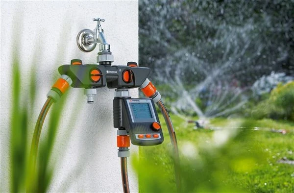 Der Wasserdurchfluss lässt sich separat für den jeweiligen Ausgang stufenlos regulieren und absperren. An den 4-Wege-Verteiler können zwei GARDENA Bewässerungscomputer oder Bewässerungsuhren angebracht werden.