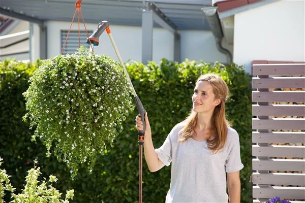 Hängende Körbe und Pflanzen in unzugänglichen Positionen können besonders einfach und genau mit dem Comfort Blumenampel-Gießstab mit schwenkbarem Kopf bewässert werden.