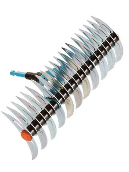 Spitze Zinken auf der einen Seite erlauben auf einer Arbeitsbreite von 35 cm ein Beseitigen von Moos und Rasenfilz, indem diese millimetertief in den Boden eindringen.