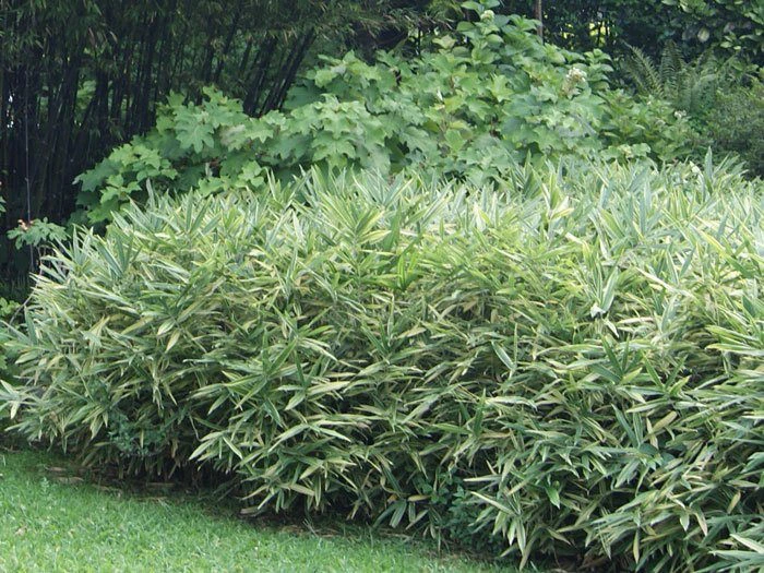 Der breitbuschige und absolut dichte Wuchs wird durch einen jährlichen Rückschnitt auf ca. 20 cm im Frühjahr noch verstärkt. Die Rhizome müssen hierbei nicht unbedingt mit einer Rhizomsperre eingegrenzt werden, da diese sehr leicht mit einem Spaten abgestochen werden können. Dies macht Ihn zum idealen Heckenbambus. Besonders auffallend an dieser Sorte ist die herrliche Streifenpanaschierung der Blätter. Diese wechseln sich in einem imposanten Farbenspiel zwischen den verschiedensten, gelb-, grün-, und weißtönen ab. Darüber hinaus erscheinen die neuen Blätter in einem leicht rötlichen Austrieb. Typisch für diese Bambusart sind auffällige und sehr dekorative Borsten an jedem Blattansatz. Die Halme sind mit einem Durchmesser von ca. 2 cm relativ dick, aber biegsam. Sie können geerntete Stängel für den Hausgebrauch oder Bastelarbeiten verwenden, da sich diese auf Grund Ihrer Struktur hervorragend verarbeiten lassen.