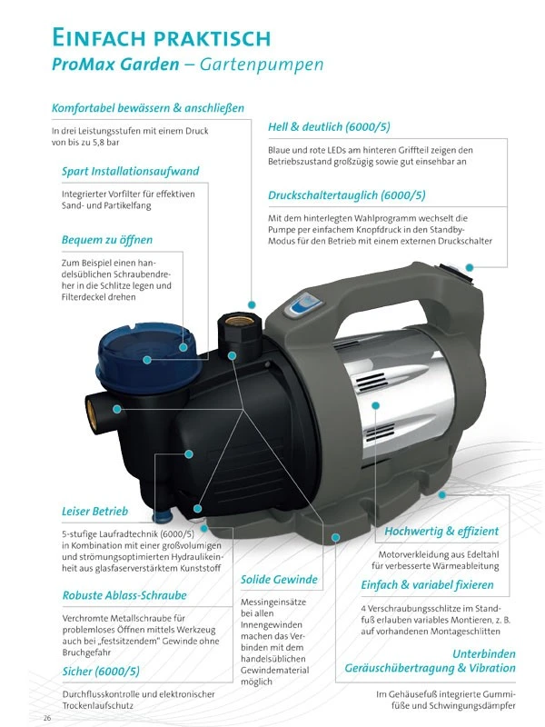 - Spart Installationsaufwand: Integrierter Vorfilter für effektiven Sand- und Partikelfang