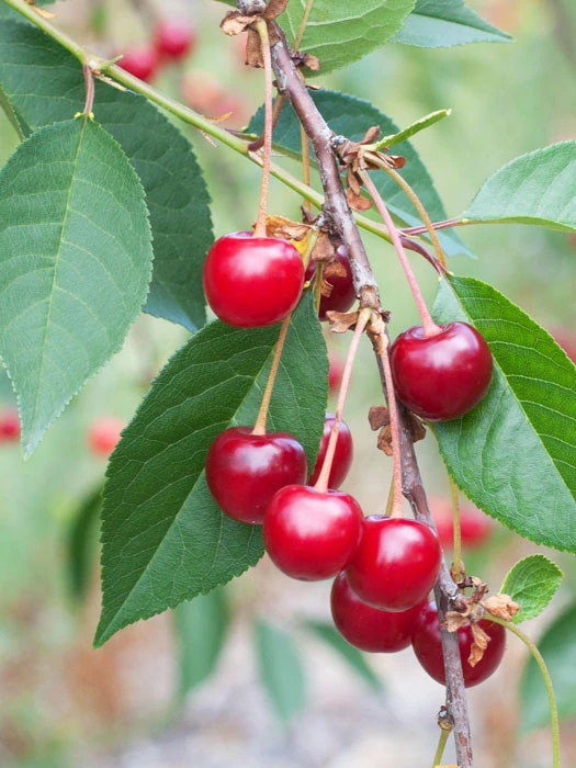 | Frucht: | Groß, leicht oval; dunkelbraunrot; Fleisch weich, intensiv roter Saft, sehr sauer, steinlösend. |