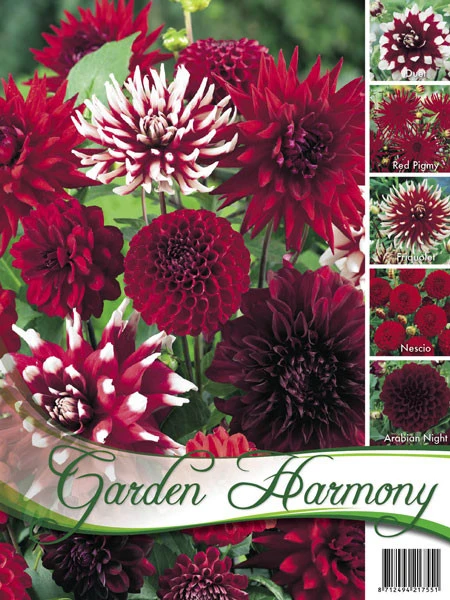 Das Sortiment besteht aus 5 Sorten roter Dahlien, die aufeinander abgestimmt sind.