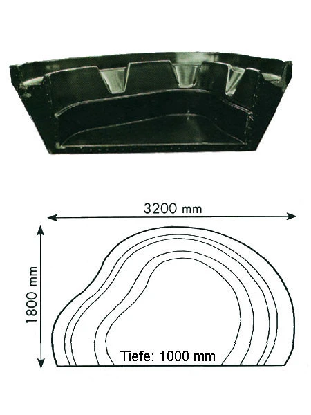 | Produkteigenschaften: – integrierte Uferzone – abgestufte Pflanzzone – frostbeständig – verrottungsfest und nahezu unverwüstlich – frei aufstellbar – UV-beständig – 15 Jahre Garantie – Grösse (L x B x T): 180 x 320 x 100 cm – Inhalt: 2.300 l – Made in Germany | ![]() |