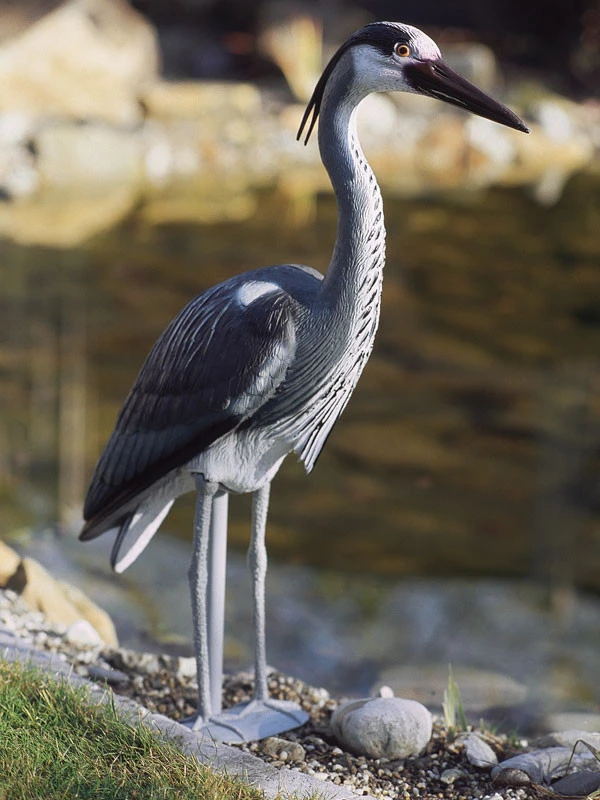 Der Fischreiher jagt ungern wo ein anderer Artengenosse arbeitet, somit kann er durch eine am Teichrand aufgestellten Figur bereits abgeschreckt werden. Zudem ist es ein schönes Deko-Element.