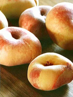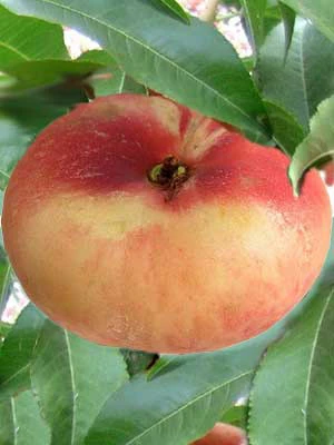 | Frucht: | Flache Fruchtform, gelbfleischig, mit intensiverem Aroma als bei den herkömmlichen, runden Pfirsichen. |
