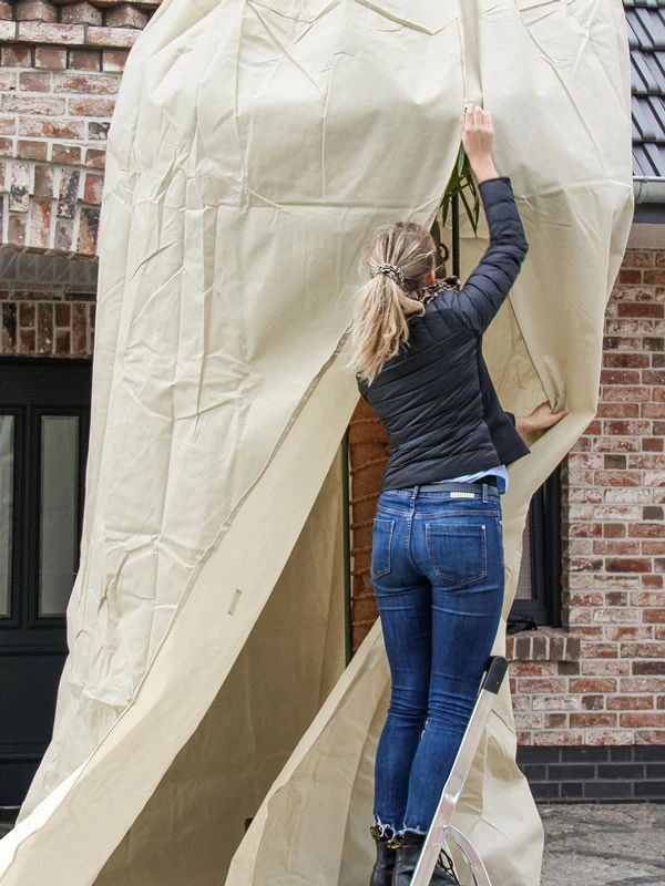 Die XXL-Vlieshaube besteht aus besonders robusten (100 g/m²), atmungsaktiven Wintervlies mit seitlich verlaufendem Reißverschluss über die gesamte Höhe. Die Haube wird einfach über die Pflanze gelegt und dann der Reißverschluss geschlossen. Unser Tipp: zwei lange (nicht ! spitze) Pflanzstäbe oder Bambusstäbe, die die Blätter etwas in der Höhe überragen, aufstellen und am Stamm befestigen. Das Gewicht der Haube (ggf. mit Schnee liegt dann auf diesen Stäben und nicht direkt auf den Blättern. Die Palmen-Vlieshaube hat oben einen flachen, geschlossenen Abschluss.